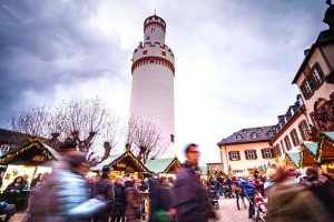 Zum Höhepunkt der Weihnachtsstadt lädt alljährlich der Romantische Weihnachtsmarkt am Schloss ein, der an den Adventswochenenden seine Gäste auf eine winterliche Reise mitnimmt. Den goldenen Sternen folgend, findet man vom Schlossplatz bis hinauf zu Bad Homburgs Wahrzeichen, dem Weißen Turm im oberen Schlosshof, vor allem viel traditionelles Kunsthandwerk und liebevoll gefertigte Geschenkideen von über 70 lokalen und regionalen Ausstellern. Serviert werden neben den Klassikern Bratwurst, Flammkuchen, Crêpes und Winzerglühwein auch vegane Spezialitäten, holländische Stroopwafels oder frisch zubereiteter Kaiserschmarrn.
