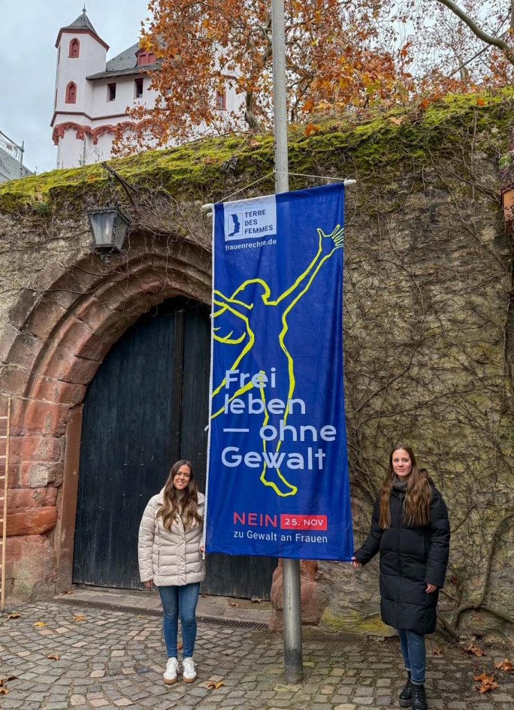 Die beiden Frauen- und Gleichstellungsbeauftragten der Stadt Eltville, Jovana Cato (l.) und Hannah Oechler (r.) haben wieder die Flagge der Frauenrechtsorganisation Terre des Femmes gehisst. Damit setzt die Stadtverwaltung ein Zeichen gegen Gewalt und für Menschenrechte. Die Flagge bleibt bis zum Tag der Menschenrecht am 10. Dezember an der Kurfürstlichen Burg gehisst. - Foto: Stadt Eltville