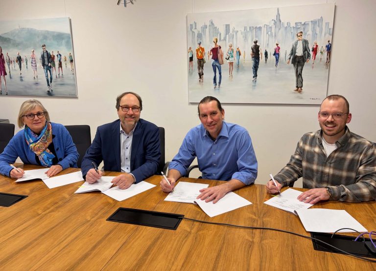 Bei der Vertragsunterzeichnung im Rathaus (v.l.): Erste Stadträtin Ingrid Schunk und Bürgermeister Lars Keitel sowie die Vorstandsmitglieder des Vereins, Jörg Waldmann und Maximilian Linker. - Fotos: Stadt Friedrichsdorf