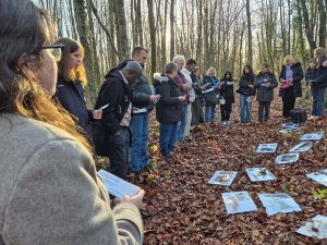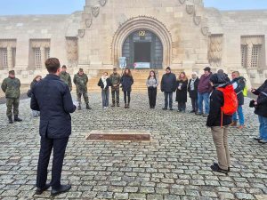 Die Schülerin Louisa Volkmar und die Projektleiterin Katarzyna Glowalla laden im Schatten des Skelett-Denkmals dazu ein, den Durchhalteparolen deutscher und französischer Heeresleitungen die unbehaglichen Gedanken einzelner Soldaten und poilus, wie die französischen Soldaten des Ersten Weltkrieges bezeichnet wurden, gegenüberzustellen. Auf Deutsch und auf Französisch prallen entpersonalisierte Sprüche zur Stärkung des Durchhaltewillens auf intime Geständnisse der Angst und Verzweiflung; kriegsverherrlichende Rhetorik der Zeit – auf Einzelschicksale und Zeugnisse des Sinnverlustes. Fachkundig führt die Projektleiterin im Folgenden in die Kämpfe auf dem Schlachtfeld Toter Mann ein. Sie lässt dabei gerne die Quellen und historische Bildaufnahmen ihre Sprache sprechen, um der Delegation einen eindrücklichen Zugang zu den erbitterten Gefechten an dem Ort, an dem für Anton Hieronymi das Leben endete, zu ermöglichen.
