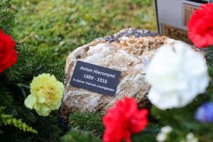 Neben dem Stein aus dem Urselbach und der Handvoll Erde, die Agnes Gerecht aus dem Garten des Geburts- und Elternhauses von Anton mitgebracht hat, und die ihr Ehemann Paul Gerecht auf dem Grab des Gefallenen verstreut, wird der Kranz der Stadt Oberursel und der Feldbergschule in Blau, Weiß und Rot niedergelegt. Stadtrat Frank Kothe, Karola Kara aus der Abteilung Kultur und Gesellschaft sowie Städtepartnerschaften und Monika Seidenather-Gröbler aus dem Vorstand des Vereins zur Förderung der Oberurseler Städtepartnerschaften treten an das Soldatengrab, um diesem einen von neun Millionen zu gedenken.