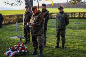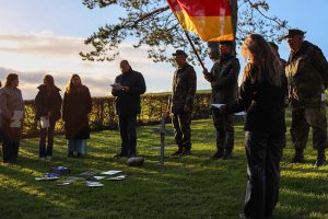 Am 9. November 2025 steht die 27-köpfige Delegation an Antons Grab auf dem Soldatenfriedhof von Dannevoux. Michael Allenstein hat die Erkennungsmarke am Kreuz befestigt. Neben ihm stehen Florian Kluge (Korvettenkapitän der Reserve), Benedikt von Schorlemer (Hauptmann der Reserve) und Dirk Liekmeier (Hauptgefreiter der Reserve) vom Kreisverbindungskommando. Die ungewöhnlich intensive Novembersonne, der frisch gemähte Rasen des Friedhofs, die zwitschernden Vögel – skurril wirkt auf Dirk Liekmeier der Widerspruch zwischen den Sinnesempfindungen und den Gedanken, die um Krieg, Verwundung und Leid kreisen.