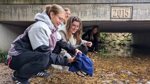 Die Schülerinnen beim Suchen von Steinen am Urselbach. – Foto: Katarzyna Glowalla
