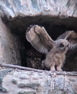Im Februar hatte das Uhu-Paar, das seit ein paar Jahren auf der Königsteiner Burg brütet, eine nicht einsehbare Schießscharte der Burgruine bezogen. Nur aus der Königsteiner Altstadt heraus gab es für die Biologin Pfenninger die Möglichkeit das Nest zu sehen, die die Wildtiere deshalb beobachtete und tolle Bilder machen konnte.