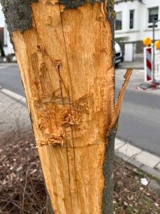 „Der angerichtete Schaden liegt vermutlich im vierstelligen Bereich“, unterstreicht Referatsleiterin Yvonne Richter. In dem Betrag enthalten seien die Fällung und Entsorgung des beschädigten Baumes, die Rodung des Wurzelstocks, die Neubeschaffung eines Jungbaums sowie die erforderlichen Pflegemaßnahmen. Abgesehen von den Kosten ist es vor allem die Tat an sich, die Richter Kopfschütteln lässt. „Wer macht so etwas und vor allem warum?“, fragt sich die Diplom-Biologin in Diensten der Kronberger Stadtverwaltung. Die Rinde sei für den Baum nicht nur „Haut“, sondern Teil seines Versorgungs- und Schutzsystems. Wenn man dieses System, wie im vorliegenden Fall, so massiv schädige, sei ein langsames Absterben der Pflanze die Folge. Dies sei auch das Ergebnis der Begutachtung gewesen, weshalb man sich für die Entnahme des elf Meter hohen und bis zur Tat kerngesunden Baumes entschieden habe.