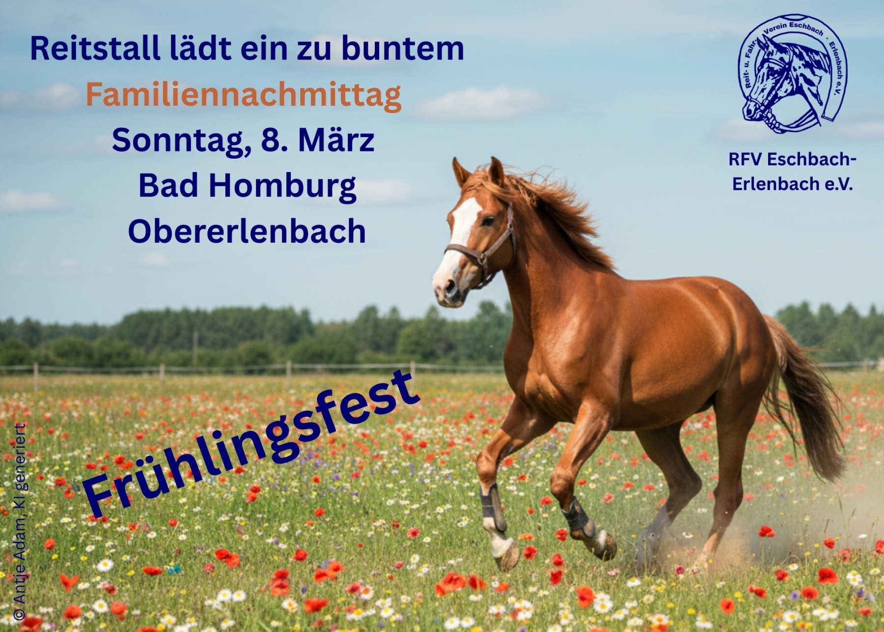 Der Reit- und Fahrverein Eschbach‑Erlenbach lädt zum Frühlingsfest in die Reithalle ein. Besucher:innen erwartet ein familienfreundliches Programm. Neben Pferde- und Ponyvorführungen der Reitschüler:innen sowie Aktionen zum Rätseln und Gewinnen, dürfen sich vor allem die jüngsten Gäste auf geführtes Ponyreiten freuen. Kreativ wird es im Vereinsheim: Dort können Kinder basteln oder Hufeisen bemalen, während Eltern das Geschehen durch das große Panoramafenster oder von der Hallentribüne aus verfolgen. Für Bewirtung mit Würstchen, Pommes, Kuchen und Getränken ist gesorgt.