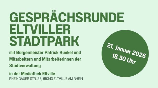 Gesprächsrunde mit Bürgermeister Patrick Kunkel sowie Mitarbeitenden der Stadtverwaltung aus den Bereichen Ordnungsamt, Kinder- und Jugendbüro und Grünflächenamt an. Thema ist die aktuelle Situation im Eltviller Stadtpark. Eingeladen sind außerdem Anwohner:innen des Eltviller Stadtparks, Kinder- und Jugendliche, der Kinder- und Jugendbeirat, die Polizeistation Eltville.