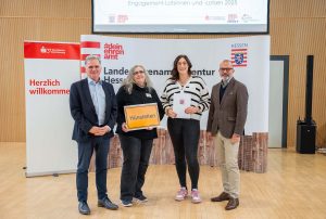 Das Repair-Café in Hünstetten haucht kaputten Dingen neues Leben ein und soll Nachhaltigkeit, Gemeinschaft und praktisches Wissen zusammenbringen. Bei der Preisverleihung (v.l.): Ralph Lorch (SV SparkassenVersicherung), Anke Müller (Gemeindevorstand), Luisa Würth und Staatssekretär Daniel Köfer. – Foto: Jason Otto / Hessische Staatskanzlei